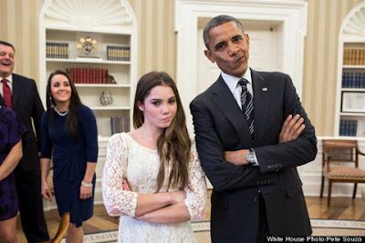 During her team's stop at the White House Thursday, she got the opportunity to pose with US President Barack Obama himself who was sport enough to imitate her now famous jaw-flexing face.